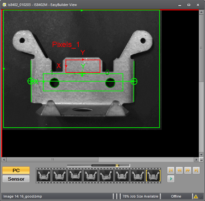 The filmstrip can be used to play back images recorded to the PC or review images and results stored to the vision system.