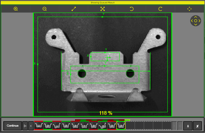 In "frozen" mode, you can navigate through the results in the filmstrip or save images from the vision system to the PC. The stored image and results are loaded to the display. Meanwhile, the job continues to run, but nothing is added to the queue. The filmstrip resumes updating if one of the following occurs: