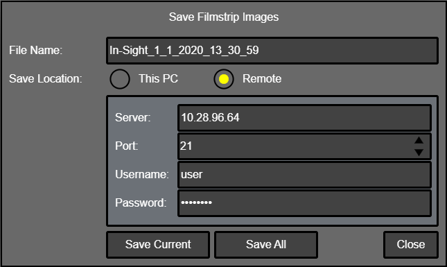 Note: If the web browser is set to automatically download files to a specific directory (such as the Downloads directory), the image(s) will be automatically saved to the location. - Remote: Saves filmstrip images to a remote FTP server. This option saves images from the connected vision system to the FTP server. If you select this option, you must specify the FTP server's address (Server), Port, Username, and Password as well.