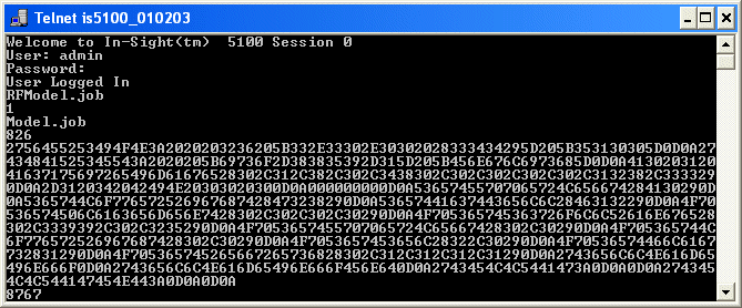 Read File コマンドを発行した後、telnet ウィンドウに出力される 1 行目はステータスコード (1) です。その後に、ジョブ名 (Model.job) とバイト単位のサイズ (826)、およびジョブデータ (ASCII 16 進フォーマット) が続きます。 最後に、4 バイトの ASCII 16 進チェックサムが最後の行 (8767) に表示されます。