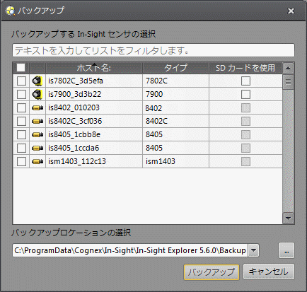 1. 左側にあるチェックボックスをオンにすることによって、バックアップするビジョンシステム/センサまたはエミュレータを選択します。SD カードにバックアップする場合は、[SD カードを使用] チェックボックスをオンにします。
