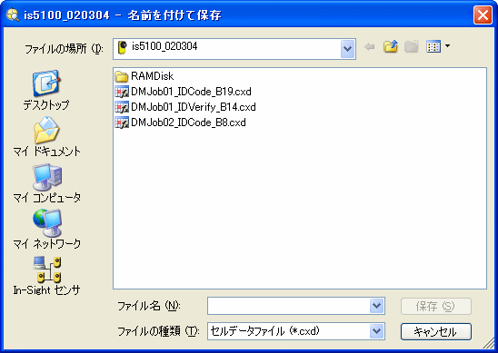 1. アクティブセルを新規ファイルとして保存するには、[ファイル名] テキストボックスに名前を入力して、[保存] をクリックします。既存のファイルを置き換えるには、リストからそのファイルを選択して [保存] をクリックします (これにより、ファイルに記録されているすべてのデータが上書きされます)。In-Sight Explorer は、エクスポートされるすべてのセルに .CXD ファイル拡張子を自動的に付加します。