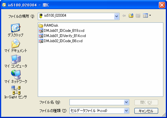 1. 開く .CXD ファイルが格納されている場所を選択します。[ファイルの場所] ドロップダウンリストには、ローカルサブネット上の In-Sight ビジョンシステムで検出されたすべてのローカルドライブとネットワークドライブ、エミュレータ、RAMDisk フォルダと SD Card フォルダ、および Explorer のホストテーブルで定義されているすべてのデバイスが含まれます。ビジョンシステムに存在する .CXD ファイルのリストを表示するには、ドロップダウンリストから対象のビジョンシステムを選択します。