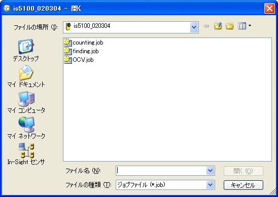 • In-Sight ビジョンシステムの設定を [ジョブを開く] ダイアログから開くことはできません。ビジョンシステム設定ファイル (proc.set) は、標準の FTP コマンドを使用することによってのみ、ネットワーク上の In-Sight エミュレータまたは In-Sight 以外の FTP デバイスから転送することができます。