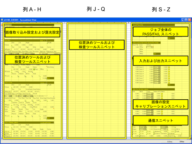 • セルの列 S ~ Z は最後の 3 番目のセクションを形成し、全体的なジョブの PASS/FAIL の結果を求める EasyBuilder スニペット、[入力] ステップと [出力] ステップ、[画像の設定] でのキャリブレーション、および [通信] ステップが格納されます。