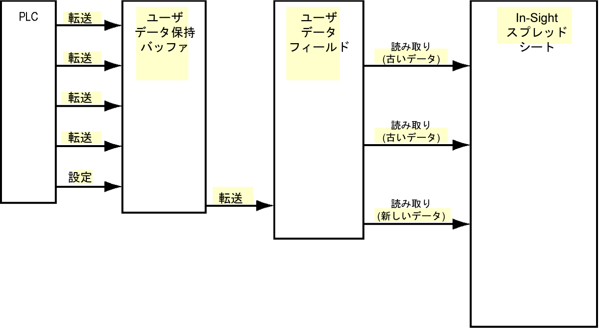 ユーザデータ保持バッファは、Transfer User Data サービスを使って PLC から書き込まれたユーザデータの一時保存場所です。このバッファを使って、ビジョンシステムへの大規模データ転送を作成して、大規模転送中のデータの整合性を確実に保つことができます。Transfer User Data サービスを実行すると、In-Sight スプレッドシートは Set User Data サービスが実行されるまでデータを読み取れなくなります。そのサービスを実行すると、In-Sight スプレッドシートですべての転送済みデータにアクセスできます。このメカニズムにより、[In-Sight] スプレッドシートは常に、一貫したデータにアクセスします。