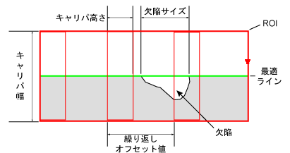 検出可能な欠陥やギャップのサイズを定義するために使用する ROI 内のキャリパ配列を指定します。検出可能な欠陥またはギャップのサイズは、検出可能なエッジの数によって決定されます。検出可能なエッジの数は、エッジに沿って配置されたキャリパの数によって決まります。InspectEdge セルがハイライトされているか、[表示] パラメータが [すべて表示] に設定されている場合、キャリパは ROI 内で赤い矩形として表示され、キャリパ内で検出されたエッジは緑色で表示されます。 注 : 検査する欠陥のタイプに応じて、キャリパをオーバラップして配置することができます。ただし、ROI に適用されるキャリパ数が増えるほど、関数の実行時間は長くなります。