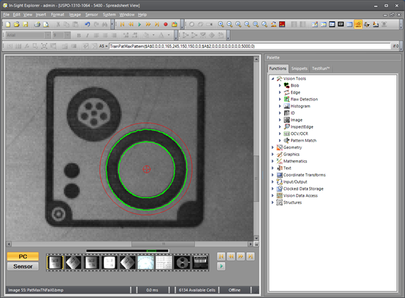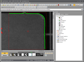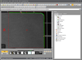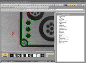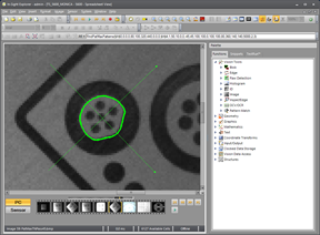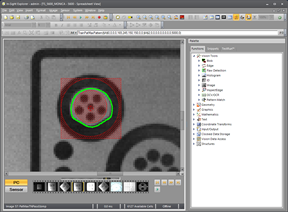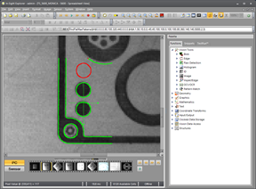 The FindPatMaxPattern function returns a successful "Pass" result in the right image even though 1/3 of the desired feature is missing. That is because the missing feature only constitutes a tiny percentage of the total model. Unless the minimum Accept parameter in FindPatMax Pattern is set to a very high value this is considered a good match. The problem with setting a very high Accept parameter value is that the first step of the FindPatMaxPattern algorithm (the initial Coarse search) is more likely to miss good candidates and cause unnecessary "Fail" results.