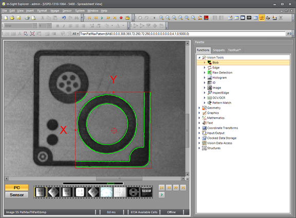 Although the TrainPatMaxPatterns Pattern Region and the FindPatMaxPatterns Find Region parameters can use any of the standard internal or external Region structures, the FindPatMaxPattern function runs faster and consumes the least amount of memory if the regions are simple rectangles and not rotated or curved. In other words, use rectangular regions aligned to the pixel grid unless there is a compelling need to rotate, curve, or use composite shapes.