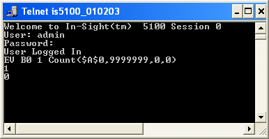 3. 接続が確立したら、クライアントは有効なユーザ名とパスワードを使用してログインする必要があります。デフォルトのログインユーザ名は「admin」、パスワードは空白文字列です。In-Sight ビジョンシステムでは、ログインの画面は表示されません。ユーザ名とパスワードの両方の後にキャリッジリターン/ラインフィード (CRLF) を送信する必要があります。