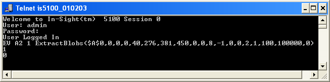 2. 次のように、Telnet クライアントを使用して In-Sight ビジョンシステムにログオンし、EV GetString(A2) と入力します。