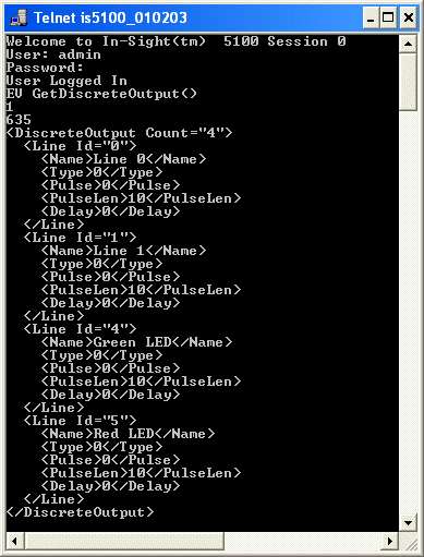 注 : 最初の XML タグ内の Count は、ディスクリート出力の数を表しています。各ディスクリート出力には、Line ID (ゼロから始まる) が割り当てられます。