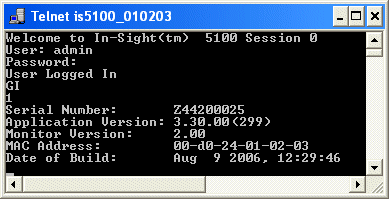 ビジョンシステムは、まず、1 を返すことにより、コマンドが正常に実行されたことを示します。以下の行には、システム情報が報告されます。