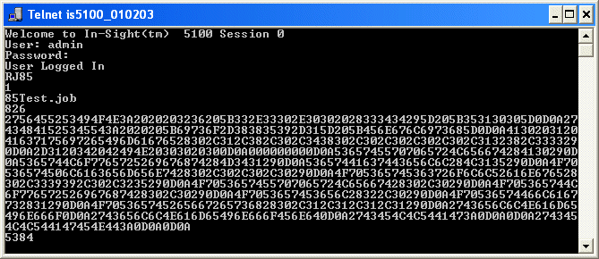 Read Job コマンドを発行した後、telnet ウィンドウに出力される 1 行目はステータスコード (1) です。その後に、ジョブ名 (85Test.job) とバイト単位のサイズ (826)、およびジョブデータ (ASCII 16 進フォーマット) が続きます。最後に、4 バイトの ASCII 16 進チェックサムが最後の行 (5384) に表示されます。