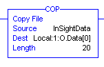 最後に、COP 命令を Main Routine ラダーロジックプログラムに追加して、DeviceNet バッファ (Local:1:0.Data[0]) から InSightData タグにデータをコピーします。