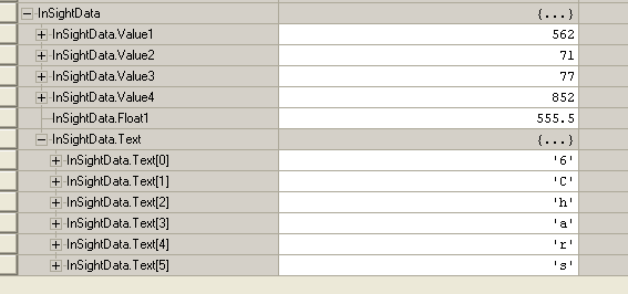 Anybus X-gateway からの TCP/IP Modbus 応答パケットは、QueryDevice 関数のバイナリ構造体に格納されます。これらの戻り値は、In-Sight Explorer で BGetInt 関数によって読み取られます。この関数は、バイナリ構造体の特定のバイトからの整数値を返し、応答は以下のような形式になります。