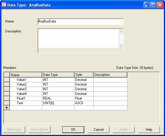 データ型に AnyBusData という名前を付けます。そのデータ型のメンバで、次の値を配置します。