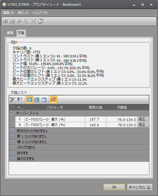 7. [修正] ボタンを押すと、[全般] タブの [ビード幅:最小 (%)] の値が自動的に更新され、同じエッジセクションが欠陥として識別されないようになります。