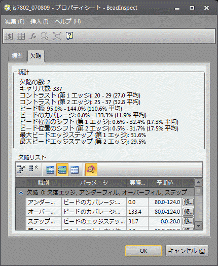 Syntax:BeadInspect(画像,ビード検出,検出エリアの編集,ビードエッジ位置の許容値 (%),コントラストしきい値,欠陥制限,グラフィックス表示