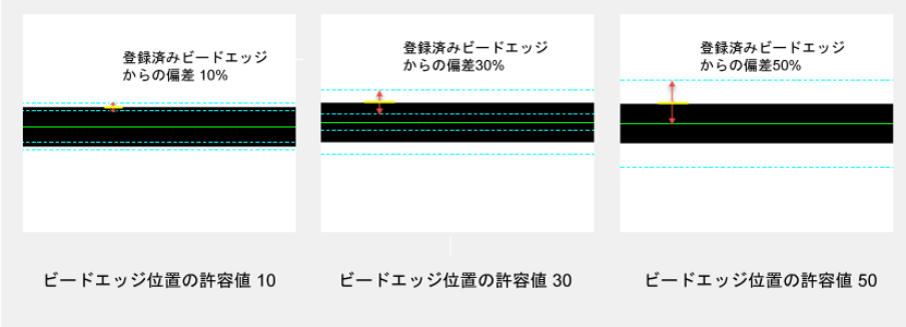 登録されたエッジ位置からエッジが外れることができる最大量 (1 ~ 200、デフォルト = 50) を、その位置のビードの平均幅のパーセンテージで指定します。許容範囲外にあるビードエッジは検出されません。