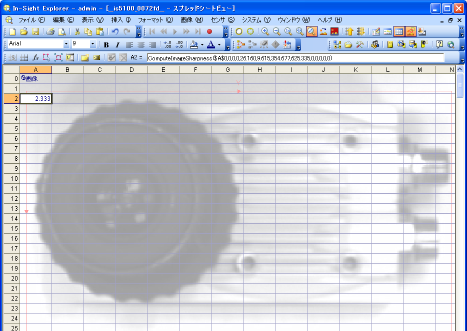 ComputeImageSharpness 関数で、In-Sight ビジョンシステムのレンズを再調整するための反復プロセスの一部として、入力画像の相対的なフォーカスの基準を計算します。