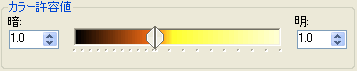 - [明]: [明] の範囲を指定します。[カラー空間] を [RGB] に設定した場合、[明] の範囲を拡大すると、登録されるカラーは (0,0,0) から登録される色の RGB 値までの線に沿って比例的に高くなります。[カラー空間] が [HSI] に設定されている場合、[明] の範囲を拡大すると、登録される色の明度が大きくなります。