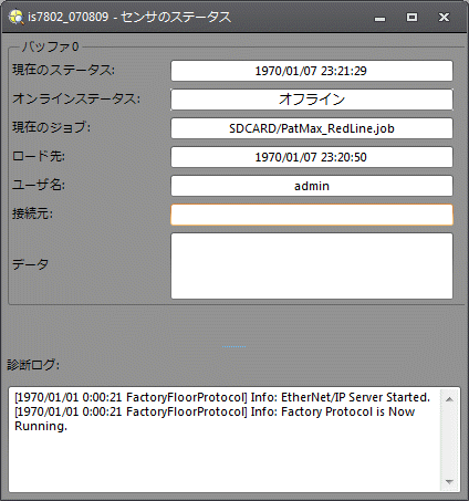 - ビジョンシステムのステータスダイアログボックスには、マシンステータススタックのすべての内容が表示されるわけではありません。In-Sight ビジョンシステムのモデル番号、ファームウェアやビルドのバージョン、前回のシステム再起動日時、および動作ステータス (アイドル /ビジー /メンテナンス ) を含むすべての内容を表示するには、GetMSBuffer 拡張ネイティブモードコマンドを使用するか、またはマシンステータスポートからアクセスします。
