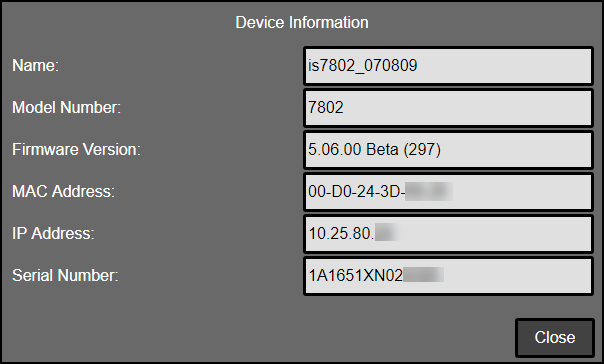 ボタンをクリックすると、[デバイス情報] ダイアロブが開き、ビジョンシステムまたはセンサのハードウェア情報とネットワーク識別情報の詳細が表示されます。