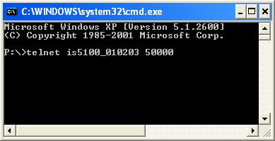 1. コマンドプロンプトを開きます。コマンドプロンプトから、Telnet クライアントを使用してビジョンシステムにログオンします。ログオンするときには、ホスト名または IP アドレスとポート番号 23 (予約済みのネイティブモードコマンドポート) を指定します。例: telnet is5100_010203 23