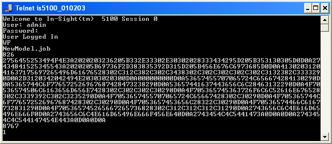 ジョブデータをジョブ「NewModel.job」に書き込むには、次のコマンドを発行します。WF。Write File コマンドを発行した後、最初に入力するのはジョブ名 (NewModel.job) で、その後にバイト単位のサイズ (826) を続けて入力します。 次に、ジョブファイルの各 ASCII 16 進バイトを入力します。 最後に、4 バイトの ASCII 16 進チェックサム (8767) を最後の行に入力します。