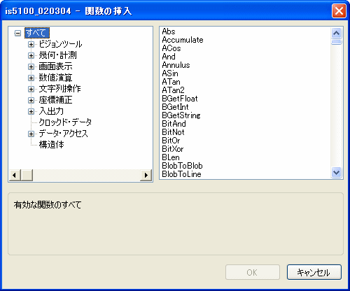 In-Sight のジョブに含まれているすべての関数は、[関数の挿入] ダイアログからスプレッドシートに配置することができます。[関数の挿入] ダイアログの左側には、ツールのカテゴリ、サブカテゴリ、および関数の展開/折り畳み可能なリストが配置されています。左側でツールのカテゴリを選択すると、そのカテゴリの関数のリストが右側に表示されます。すべての In-Sight 関数については、関数リファレンスで詳しく説明されています。