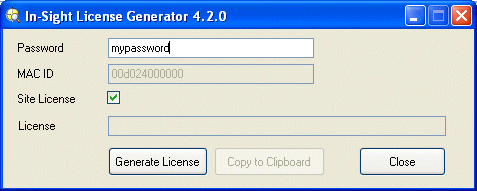- Windows の [スタート] メニューを開き、[すべてのプログラム] → [Cognex] → [In-Sight] → [In-Sight x.x.x] → [In-Sight ライセンスジェネレータ] をクリックして、In-Sight ライセンスジェネレータを開きます。