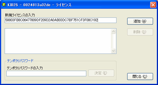 注 : [EasyBuilder ライセンス] ダイアログに、[テンポラリパスワードの入力] フィールドは含まれません。 - [追加] ボタンをクリックします。