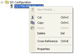 I/O Configuration フォルダで、DeviceNet モジュール (この例では 1756-DNB) を右クリックし、[プロパティ] を選択します。
