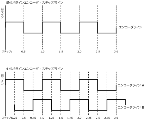 :  [ラインごとのステップ数] の値は、シングルラインハードウェアエンコーダの場合は 0.5 ずつ、直交ハードウェアエンコーダの場合は 0.25 ずつの値で設定する必要があります。