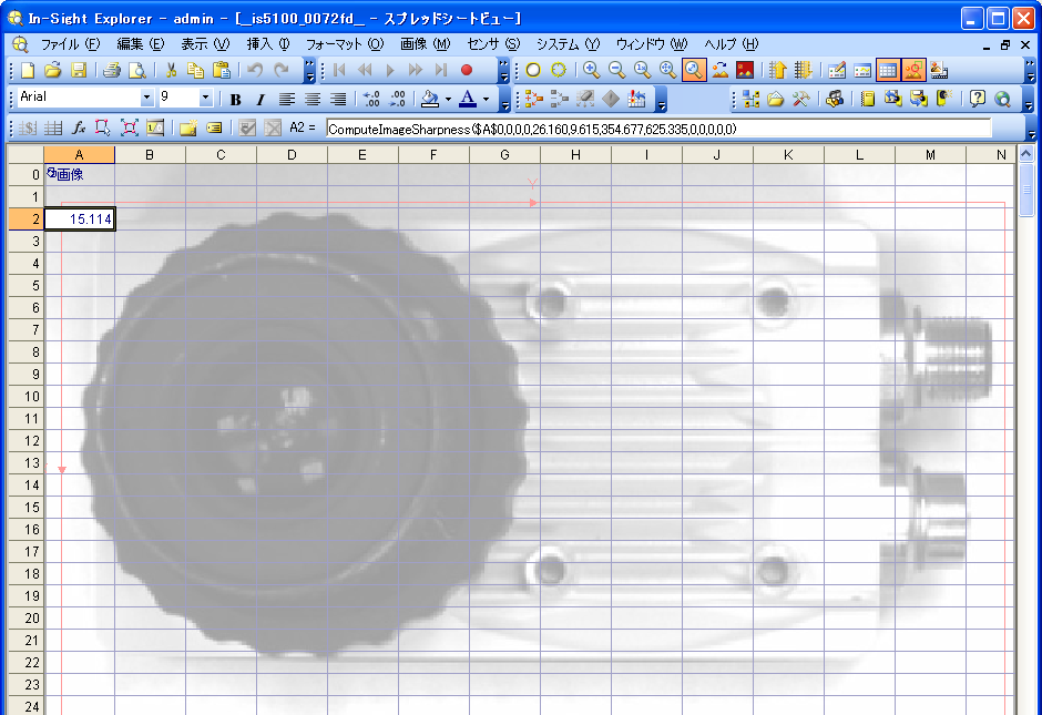 ComputeImageSharpness 関数で、In-Sight ビジョンシステムのレンズを再調整するための反復プロセスの一部として、入力画像の相対的なフォーカスの基準を計算します。