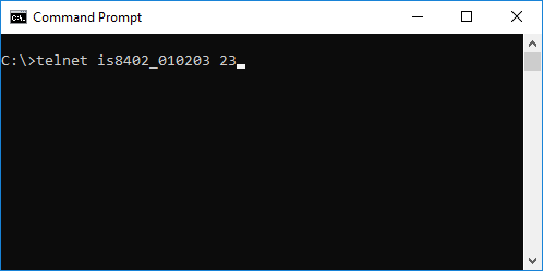 1. Open a command prompt. From the command prompt, log on to the vision system using a telnet client. When logging on, specify the host name or IP address and port number 23, which is the reserved Native Mode command port. For example: telnet is8402_010203 23.