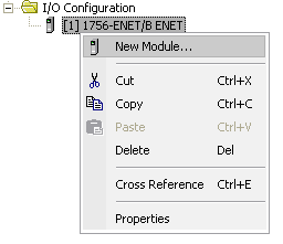 Under the I/O Configuration node, select the Ethernet Node under the Ethernet Module, right-click on the icon and select New Module from the menu: