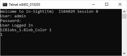 However, you would like to change that parameter's setting programmatically, to either Black/0 or White/1, based on a particular product part. Issue the command SIBlobs_1.Blob_Color 1, as shown in the following telnet client window: