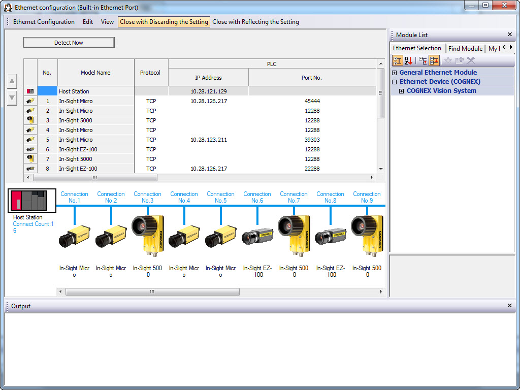 - Up to 16 In-Sight vision system may be displayed (in ascending order of their IP addresses) on the Ethernet Configuration window after executing the automatic detection of connected devices.