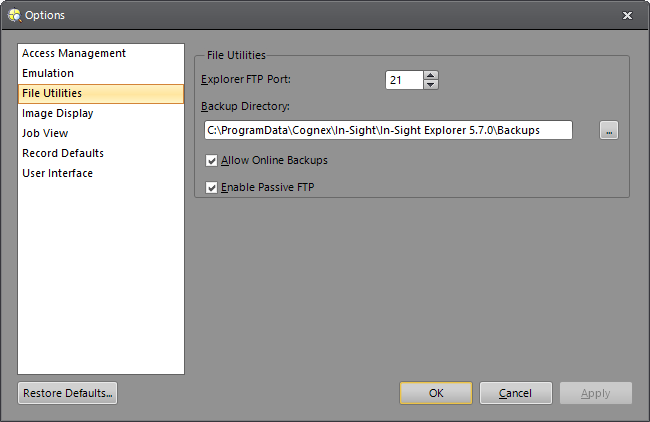 Backup Directory: Defines the folder on the local PC that In-Sight Explorer stores backups of In-Sight vision systems or emulators. The default location is: C:\ProgramData\Cognex\In-Sight\In-Sight Explorer x.x.x.