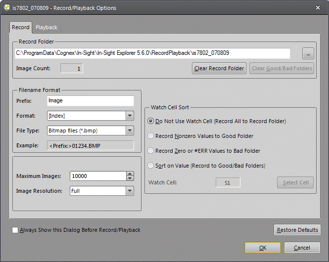 Note: There are three watch cells (Job Pass/Fail cell, Filmstrip Watch cell and Record/Playback watch cell) with similar effects in In-Sight. All three watch cells can be set independently, and control different functionality.- Do Not Use Watch Cell (Record All to Record Folder): Records all images to the Record Folder. The Watch Cell is not enabled.