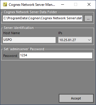When prompted, specify the Cognex Network Server Data Folder and the 'adminserver' password in the Cognex Network Server dialog.
