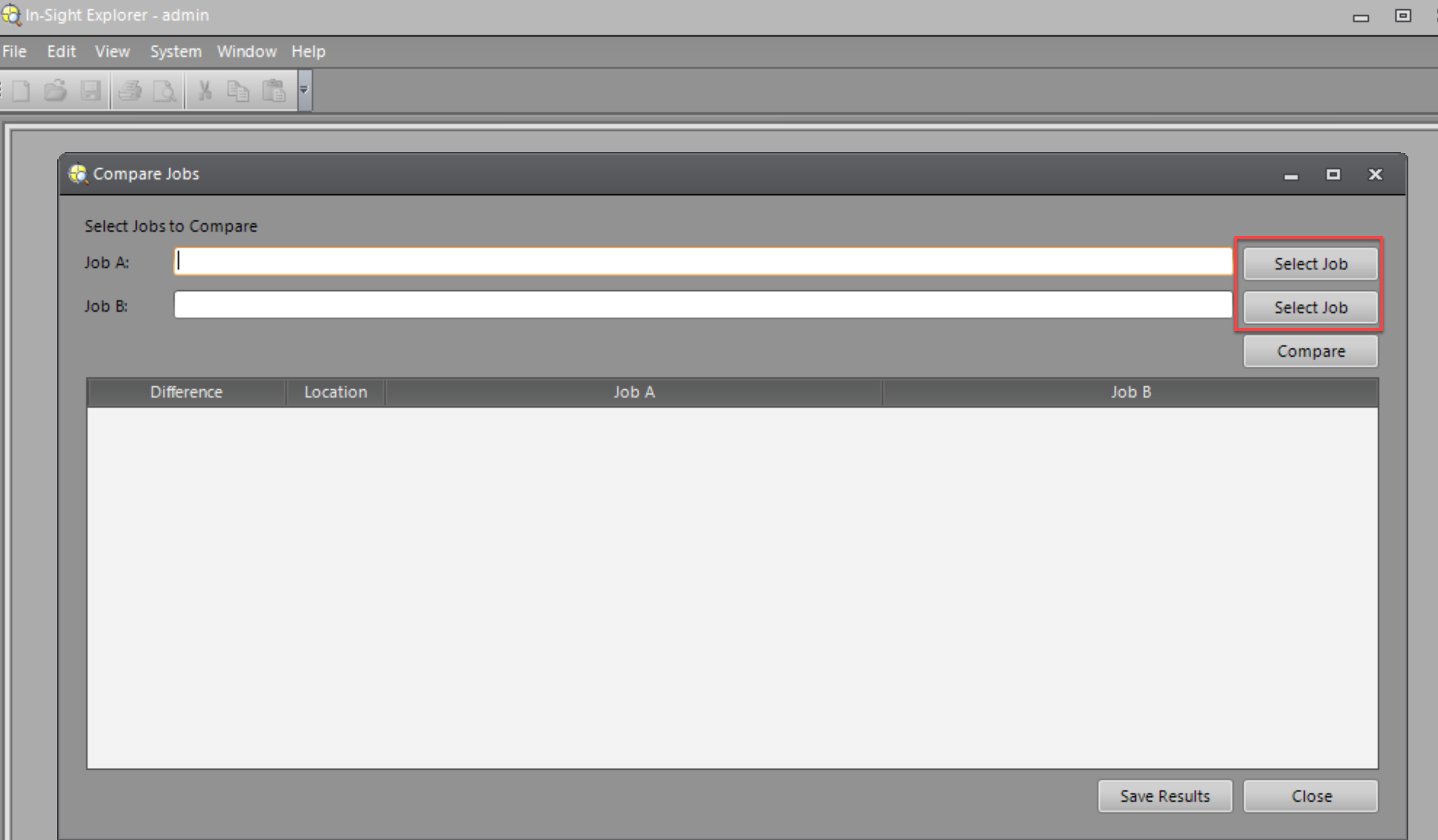 In the Compare Jobs window, click on the Select Job button next to the Job fields (Job A and Job B) to select the jobs you want to compare.