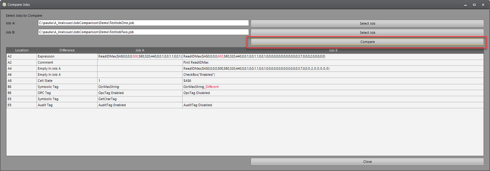 Click on the Compare button, to view a report showing the differences of two jobs you selected.