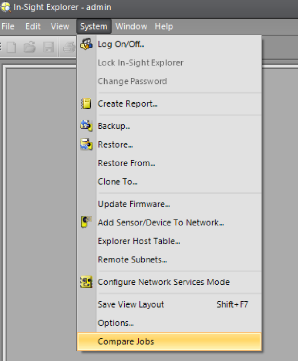 Click System > Compare Jobs in the top left menu bar of the In-Sight Explorer application.
