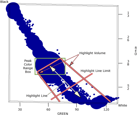 • The Highlight Line represents the surface reflection component, and extends from the Peak Color to the limits of the histogram along the illumination vector (White; 255,255,255).