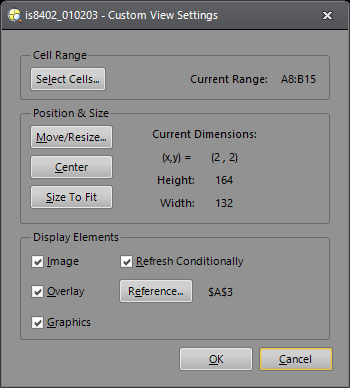 • Size To Fit: Resizes the Custom View to fit the range specified in Select Cells; this overrides any size set by Move/Resize.