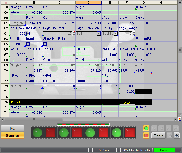 - View the updated status graphics in the filmstrip, which represent the pass/fail results. The vision system remains Online, but the filmstrip stops updating and enters "frozen" mode (indicated by a yellow bar at the top of the display area) if any of the following occurs: