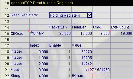 These values are in the floating-point format. In the ProfibusGateway.cxd file, the BGetInt function in cell D21 reads the binary value at Byte 15 (the lower byte of the word read).